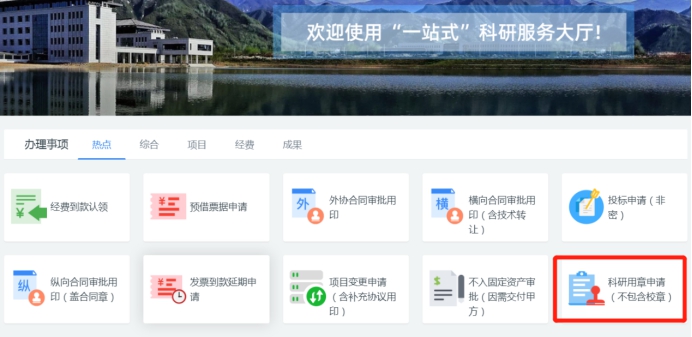 2. 办理地址:登录翱翔门户,点击“科研系统”进入系统成人视频;在成人视频办理事项栏选择“科研用章申请”。