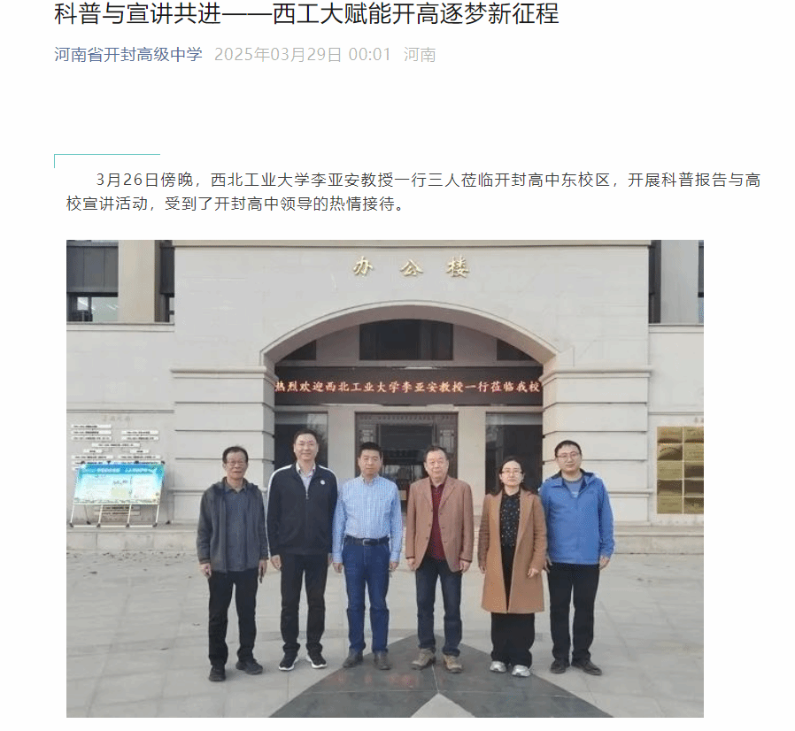 学子于25-28日赴开封市杞县中学、开封高中和河南大学附属中学三所重点高中,开展为期四天的“科技进校园”系列活动。活动涵盖科普讲座、招生政策解读、赠送喜报及科技展演等内容,累计吸引超2500名师生参与,掀起校园科技热潮。