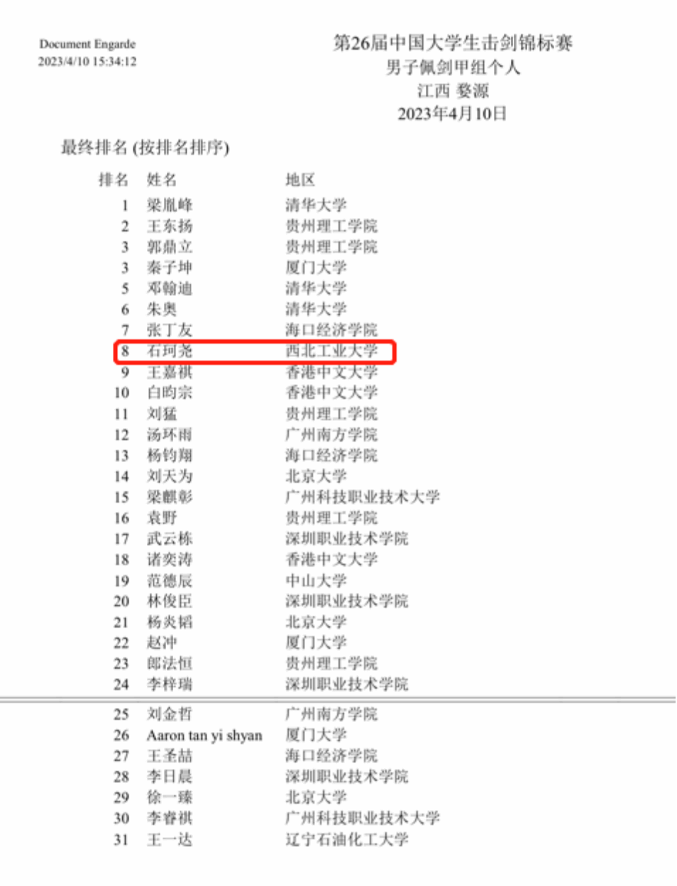 的石珂尧同学代表学校参加了男子佩剑甲组的比赛,最终取得了学校男子佩剑历史最好成绩,全国赛第八名!