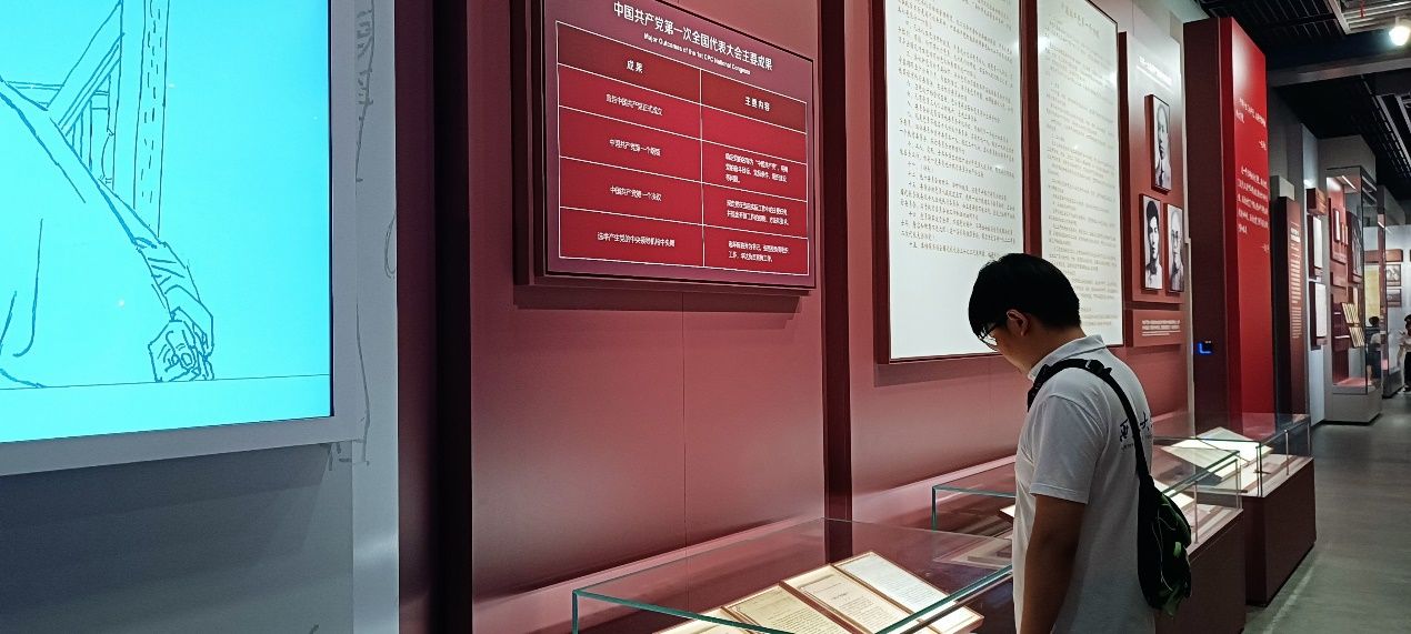 随后,实践队员们步入中共一大会址纪念馆内部,追随《伟大的开端——中国共产党创建历史陈列》脚步,相继参观了“前仆后继,救亡图存”、“民众觉醒,主义抉择”、“早期组织,星火初燃”、“开天辟地,日出东方”等7个展区,深入了解了中国共产党的发展历程、党的初心和使命以及中国共产党在中国革命和建设事业中的伟大贡献,真切感受到了革命先驱们争取民族独立、人民解放和国家富强所做出的艰苦努力。走在纪念馆的展厅里,13位一大代表铜像、72个版本的《共产党宣言》、1:1实景复原的中共一大会址场景,都在讲述着开天辟地、可歌可泣的建党历史,让实践队员们在所看所听所感中真正理解中国共产党为什么“能”、马克思主义为什么“行”、中国特色社会主义为什么“好”。