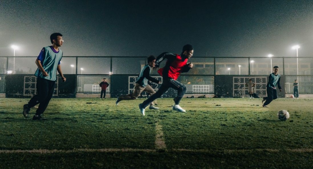 足球赛场上,四支队伍、十四个班级展开了激烈的角逐。运动员们在绿茵场上奔跑、拼抢,展现出速度与拼搏的完美结合。