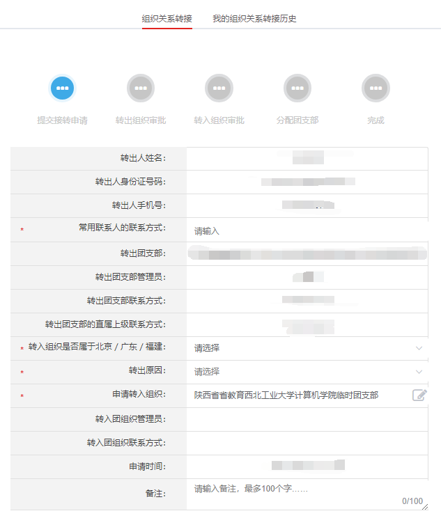 3.进入业务界面如实填写信息。申请转入组织一栏,若所在支部在系统中已有组织,可直接选择转入;若所在支部尚未建立组织或尚未明确所在支部,则转入临时支部并备注个人情况。(成人视频