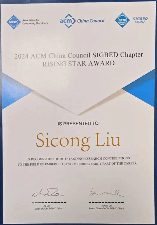 人机物融合智能计算团队青年教师刘思聪副教授先后荣获国际会议ACM SenSys 2024 最佳论文提名奖和ACM SIGBED 2024中国新星奖。