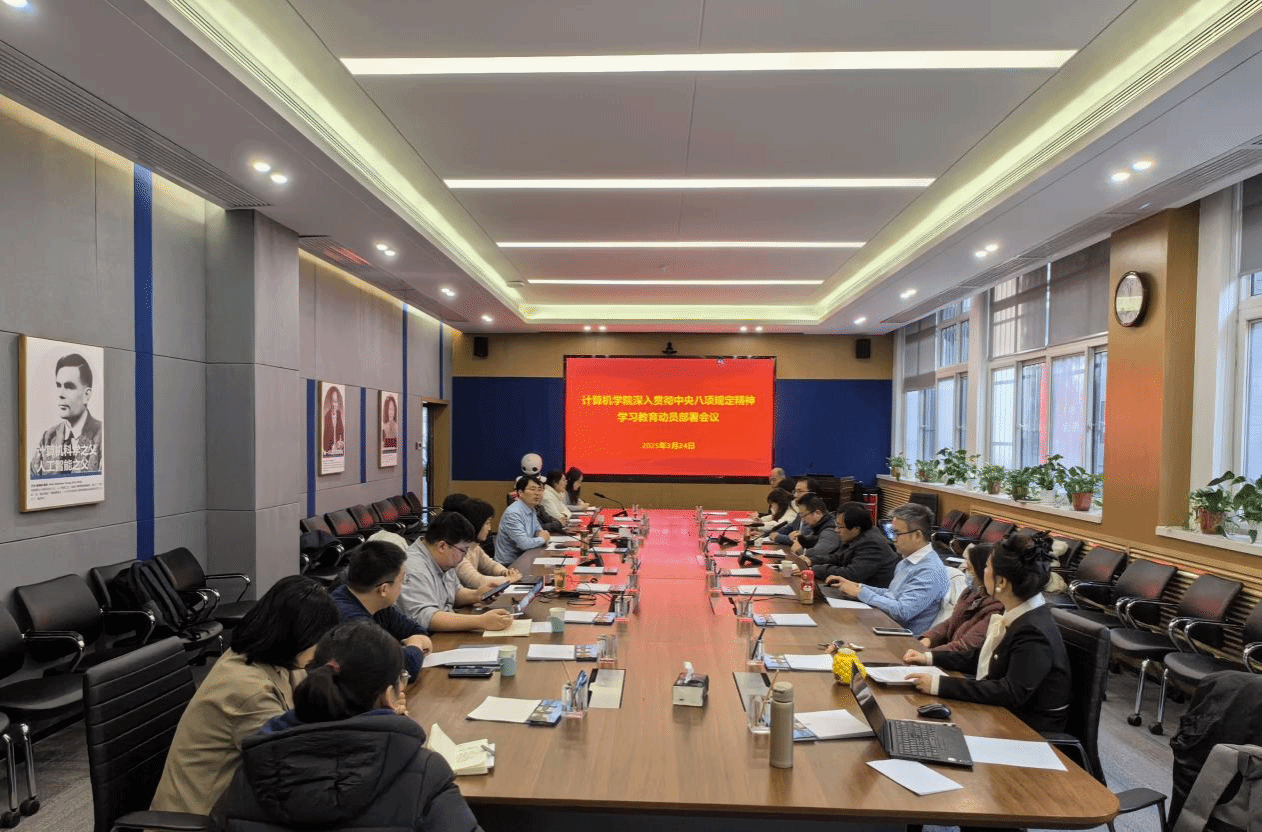 会议强调,在全党开展深入贯彻中央八项规定精神学习教育,是党中央作出的重大决策部署,是今年学校和学院党建工作的重点任务。全体党员干部要深刻领会开展学习教育的重要意义,切实增强开展学习教育的思想自觉、政治自觉、行动自觉,把思想和行动统一到党中央重大决策部署上来,准确把握开展学习教育的目标要求,锲而不舍贯彻中央八项规定精神,加强组织领导,融入日常、抓在经常,一体推进“学、查、改”,自觉内化于心、外化于行,坚持“三个永远”,将学习教育与落实学校党委重大决策部署、推动学院高质量、高水平、高速度发展相结合,将学习教育与完成学院年度目标责任制和重点工作相结合,将学习教育成果转化为涵养优良师德师风、班风学风,着力解决制约高质量发展的瓶颈问题,不断激发师生服务建设教育强国、科技强国、人才强国的源源动力,扎实推动一流计算机学科建设和作风建设常态化长效化。