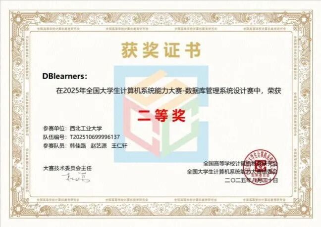 参赛队凭借学校自研编译器在线评测平台 NPUCOJ 进行测评并迭代优化,在 151 支队伍中获全国二等奖。数据库管理系统设计赛中,我校成人视频