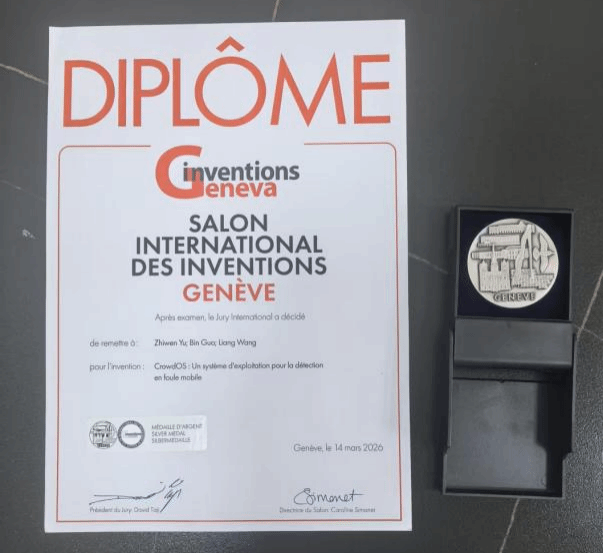 於志文教授、郭斌教授团队的成果“CrowdOS:面向移动群智感知的操作系统”经国际专家评审与现场展示交流,荣获展会银奖,在国际舞台上展现了我校在普适计算与群智感知领域的科研实力。