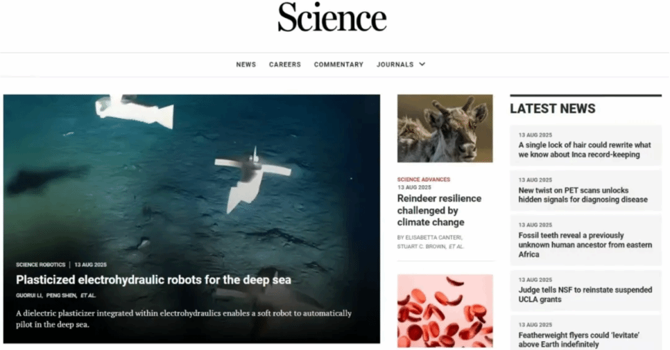 近日,我院人机物融合智能计算团队负责人於志文教授参与完成的最新研究成果“Plasticized electrohydraulic robot autopilots in the deep sea”被国际顶级期刊《Science Robotics》录用并在线发表。该研究面向高温、低压等极端条件下的深海高端装备领域,成功研发了新一代海洋软体机器人,并在1369米深度冷泉区和4070米深度海山区成功测试部署,获得了《Science》期刊官方主页专题报道。该成果由哈尔滨工程大学、成人视频