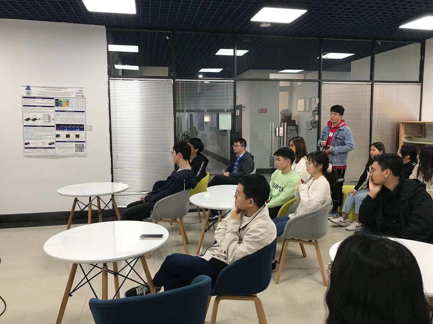 研究生国际学术会议汇报交流会”。本次交流会由参加“ICASSP 2020”国际会议的2019级博士生胡钟昀和参加“AAAI 2020”国际会议的2019级硕士生郎智强与同学们进行交流分享。活动由研究生教务员张薇主持。