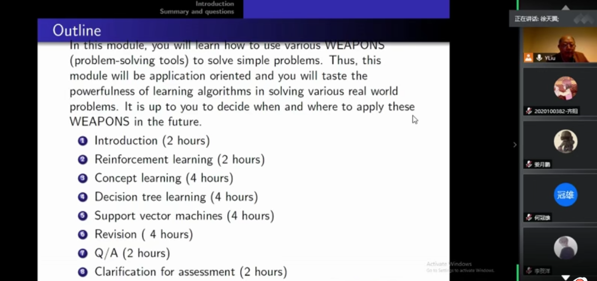 2020年暑期国际学堂《Machine Learning(机器学习)》于7月13日正式开启线上课程。该课程由英国Edge Hill 大学可视计算中心主任刘永怀教授为学生们讲授。刘永怀教授的主要研究方向是三维计算机视觉、图像处理、模式识别、机器学习、人工智能和智能系统。目前是IEEE高级会员, 英国HEA( Higher Education Academy)的Fellow ,也是多个国际期刊和会议的主编或编委。在IEEE Transaction等顶级期刊和国际会议上发表论文180多篇。