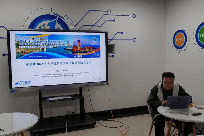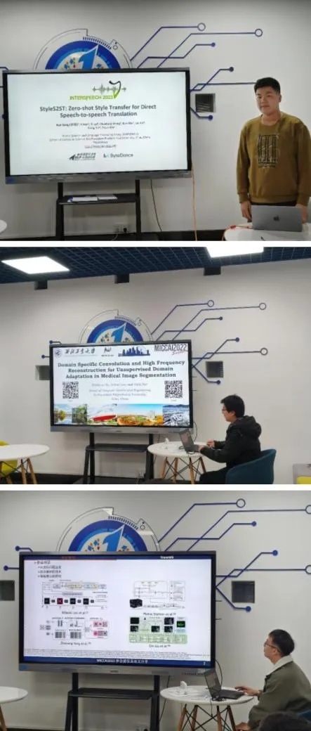 Song Kun shared his experience of attending Interspeech2023 and gave a brief introduction to the team's paper on speech to speech translation. Hu Shishuai shared his MICCAI2022 attending experience and his paper on unsupervised domain adaptive medical image segmentation reconstructed based on domain specific convolution and high-frequency component with his classmates. Zhang Shaoteng briefed on the team's achievements in weakly supervised tissue pathology image segmentation based on Transformer.